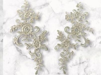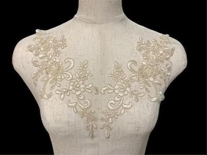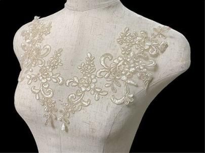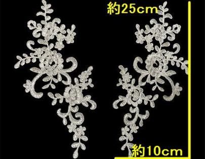 注意事項についてご承諾頂いた上でご注文願います。 【商品詳細】 ウエディングドレスに使用されるドレス用のモチーフです。 シンプルな刺繍のみのモチーフです。 【サイズ】 縦最大 約25センチ 横最大 約10センチ 画像を参照頂きご確認お願いいたします。 サイズは大体の目安としてご参考までにお願いいたします。 ※表示画像はお使いのモニターにより異なる場合がございます。 【ご注意事項】 必ずご一読お願いいたします。 海外からの輸入商品となります為、日本製のような完璧な商品をお求めの場合は ご遠慮ねがいます。検品はしておりますが、多少のエラー等が含まれる場合がございます。 製品は機械刺繍されております。 入荷時からきれいに処理されていない状態のものもございます。 入荷時期により(ロット違い)色合いやサイズ、形状が若干異なる場合がございます。 ご了承の上お買い求め願います。 機械刺繍の為糸のテンションにムラがある場合がございます。 ペアモチーフの場合、左右の糸の差異があるものがあり、色合いが若干異なる場合がございます。 配送の際には2つ折りもしくは3つ折りにしての 梱包配送となりますことをご了承願います。 繊細なモチーフですので ご使用用途により、摩擦などの力により破損する恐れはございます。 また色落ち色移りする可能性もございますのでご注意お願いいたします。 細かな刺繍となっております。糸キレ/糸抜けする可能性がございますので お取り扱いには処理をお願いいたします。 ご注文後のご変更およびお客様ご都合によるキャンセルはお受けできません。 フリーメール、携帯メールではメールフィルターによりメールが届かないことが 稀に発生しております為、フリーメールおよび携帯メールでのご注文の方には 当店携帯端末よりもメールでご連絡させていただきます。 商品は装飾品となります。 本来の用途以外にお使いにならないでください。 食べ物ではございませんので、誤って口に入れないようにご注意お願いいたします。 小さなお子様の手の届かない場所で保管してください。 誤飲や怪我などの恐れがございますので、小さなお子様の手の届かないところで 保管ねがいます。 鋭角、鋭利な物もございますため、怪我などに十分ご注意お願いいたします。 強く押したり、曲げたり、ぶつけたり、摩擦など無理な力が加わることで破損 する恐れがありますのでご注意ください。 製品によりコーティングフィルムやカラーフィルムが捲れたり・剥がれたりする可能性 色落ち・色移りする可能性があります。 お取扱いには充分ご注意ください。 火気のある場所、高温・多湿の場所、直射日光の当たる場所には放置しないでください。 廃棄の際は各地方自治体の廃棄区分に従ってください。 本品ご使用による人体・衣類等すべての製品への損傷に関しましては当店では 一切の責任を負いかねますので予めご了承のうえでご使用ください。 本製品ご使用による身体や衣類、装飾へのすべての破損、損傷につきましては 当方では一切の責任は負いかねますことをご承知おきの上ご購入ねがいます 最近チェックした商品