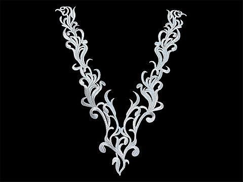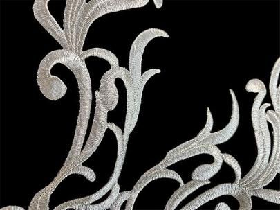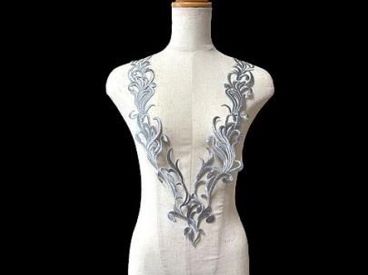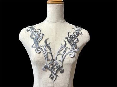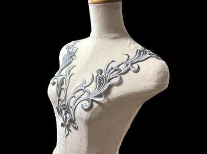 レースモチーフ 080 SILVER 銀糸で刺しゅうされたモチーフです。(アイロン接着可能)★★★★★  この商品のレビュー  ★★★★★ スケート、新体操、ダンス、社交ダンス、鞄等にいかがでしょうか? アイロン接着、ボンド接着、または縫い付けでお使いください。 刺繍の上にラインストーンを貼り付けても綺麗だと思います。 大きさは画像に記載しておりますが、だいたいの目安として お考え願います。 当方では推奨はいたしませんが 部分的にカットしてお使いいただくことも可能だと思います。 その際はほつれてこないように カットした箇所にボンド(当方販売しておりますE6000)を 接着していただき硬化させてからお使いください。 海外からの輸入品となります。 必要数に満たない場合はお取り寄せもさせていただきます 期間は約2週間前後とお考え下さい。 機械刺繍されております。 モチーフ周囲はヒートカットされておりますので、きれいに処理されていない 箇所もございます。 繊細なモチーフですので ご使用用途により、摩擦などの力により破損する恐れはございます。 また色落ち色移りする可能性もございますのでご注意お願いいたします。 細かな刺繍となっております。糸キレ/糸抜けする可能性がございますので お取り扱いには処理をお願いいたします。 本製品ご使用による身体や衣類、装飾へのすべての破損、損傷につきましては 当方では一切の責任は負いかねますことをご承知おきの上ご購入ねがいます 最近チェックした商品