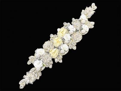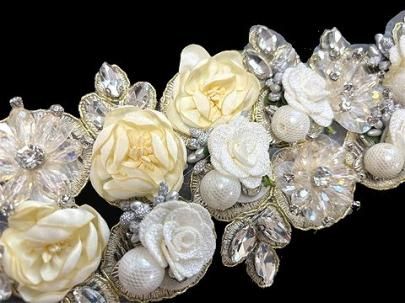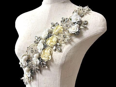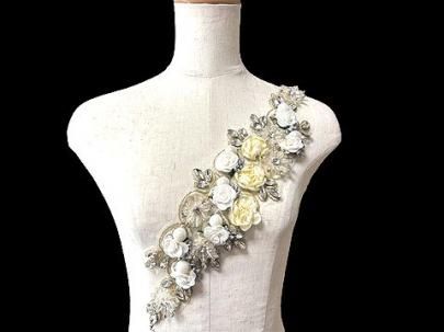 3D レースモチーフ 立体的に作られた手作りのモチーフです。 【参考色名】 アイボリーホワイト 【大きさ】 長さ約40センチ 幅最大約10センチ ストーンもビーズもお花も一つひとつ職人の 手によって作られた大変手間のかかっている ゴージャスなモチーフです。 ウエディングドレス、、カラードレスのために 作られた美しいモチーフとなっております。 まるでプリンセスのドレスについているような装飾 ですよ! 一つ一つ手作りのため、作り手により若干お花の形が 違う場合がございます。(花の開き方や大きさなど) スケート、新体操、ダンス、社交ダンス、鞄等にいかがでしょうか? 縫い付けまたは接着にてお使いください。 当店では推奨はいたしませんが 一部カットできそうな箇所があります。 カットされた場合はE6000でカットした 箇所を固めていただきお使いください。 海外からの輸入品となります。 在庫後れの場合は再入荷まで2週間前後要します。 お問い合わせください。 繊細なモチーフですので ご使用用途により、摩擦などの力により破損する恐れはございます。 また色落ち色移りする可能性もございますのでご注意お願いいたします。 細かな刺繍となっております。糸キレ/糸抜けする可能性がございますので お取り扱いには処理をお願いいたします。 輸入品となるため日本製のように完璧なものをお求めの場合はご遠慮ください。 本製品ご使用による身体や衣類、装飾へのすべての破損、損傷につきましては 当方では一切の責任は負いかねますことをご承知おきの上ご購入ねがいます 最近チェックした商品