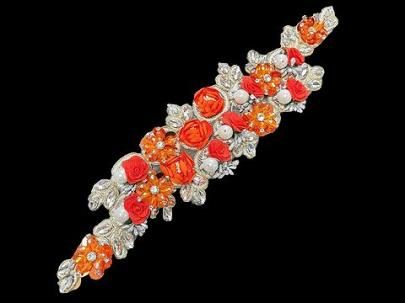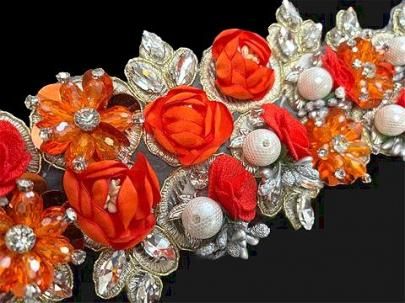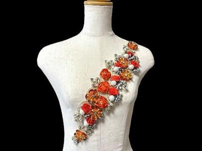 3D レースモチーフ 立体的に作られた手作りのモチーフです。 【参考色名】 オレンジ 【大きさ】 長さ約40センチ 幅最大約10センチ ストーンもビーズもお花も一つひとつ職人の 手によって作られた大変手間のかかっている ゴージャスなモチーフです。 ウエディングドレス、、カラードレスのために 作られた美しいモチーフとなっております。 まるでプリンセスのドレスについているような装飾 ですよ! 一つ一つ手作りのため、作り手により若干お花の形が 違う場合がございます。(花の開き方や大きさなど) スケート、新体操、ダンス、社交ダンス、鞄等にいかがでしょうか? 縫い付けまたは接着にてお使いください。 当店では推奨はいたしませんが 一部カットできそうな箇所があります。 カットされた場合はE6000でカットした 箇所を固めていただきお使いください。 海外からの輸入品となります。 在庫後れの場合は再入荷まで2週間前後要します。 お問い合わせください。 繊細なモチーフですので ご使用用途により、摩擦などの力により破損する恐れはございます。 また色落ち色移りする可能性もございますのでご注意お願いいたします。 細かな刺繍となっております。糸キレ/糸抜けする可能性がございますので お取り扱いには処理をお願いいたします。 輸入品となるため日本製のように完璧なものをお求めの場合はご遠慮ください。 本製品ご使用による身体や衣類、装飾へのすべての破損、損傷につきましては 当方では一切の責任は負いかねますことをご承知おきの上ご購入ねがいます 最近チェックした商品