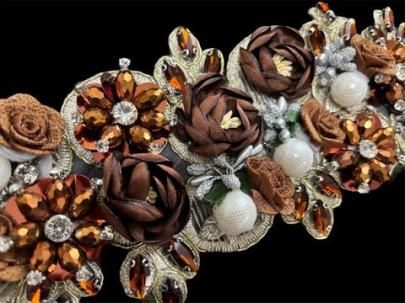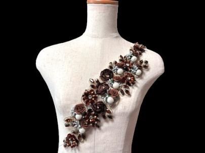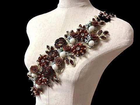 3D レースモチーフ 立体的に作られた手作りのモチーフです。 【参考色名】 茶色 【大きさ】 長さ約40センチ 幅最大約10センチ ストーンもビーズもお花も一つひとつ職人の 手によって作られた大変手間のかかっている ゴージャスなモチーフです。 ウエディングドレス、、カラードレスのために 作られた美しいモチーフとなっております。 まるでプリンセスのドレスについているような装飾 ですよ! 一つ一つ手作りのため、作り手により若干お花の形が 違う場合がございます。(花の開き方や大きさなど) スケート、新体操、ダンス、社交ダンス、鞄等にいかがでしょうか? 縫い付けまたは接着にてお使いください。 当店では推奨はいたしませんが 一部カットできそうな箇所があります。 カットされた場合はE6000でカットした 箇所を固めていただきお使いください。 海外からの輸入品となります。 在庫後れの場合は再入荷まで2週間前後要します。 お問い合わせください。 繊細なモチーフですので ご使用用途により、摩擦などの力により破損する恐れはございます。 また色落ち色移りする可能性もございますのでご注意お願いいたします。 細かな刺繍となっております。糸キレ/糸抜けする可能性がございますので お取り扱いには処理をお願いいたします。 輸入品となるため日本製のように完璧なものをお求めの場合はご遠慮ください。 本製品ご使用による身体や衣類、装飾へのすべての破損、損傷につきましては 当方では一切の責任は負いかねますことをご承知おきの上ご購入ねがいます 最近チェックした商品